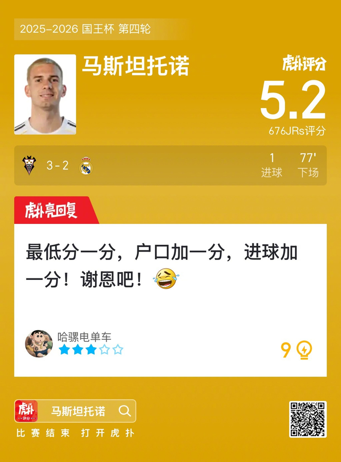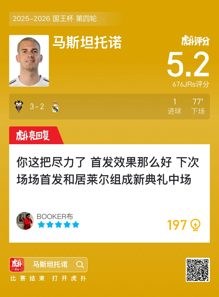 #阿尔瓦塞特3比2皇马##皇马国王杯遭西乙保级队淘汰# 马斯坦托诺打进一球,赛后收获5.2的虎扑评分!
