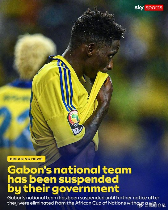 【开除】《队报》:加蓬队在非洲杯小组出局,该国的代理体育部长宣布暂停国家队一切活动,解散教练组,并点名将奥巴梅扬和曼加两名球员开除出国家队。