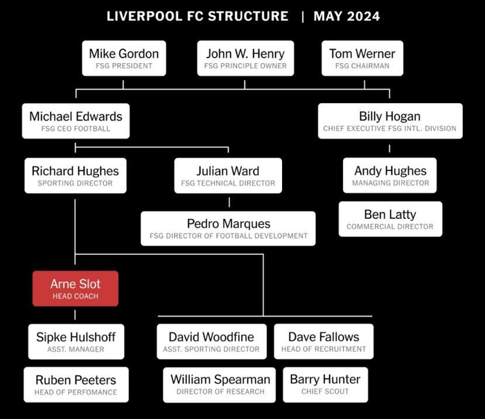 相比来说,斯洛特的故事就温和得多,但也最直接地拷问着利物浦的模式。作为官方定义的“Head Coach”,他的汇报线很明确:足球总监休斯,而休斯则又需要汇报给全球体育总监、利物浦昔年的体育总监:爱德华兹。而从多方汇集的信息看,斯洛特与休斯讨论引援方向,休斯确定最终人选,而训练则由斯洛特完全负责。