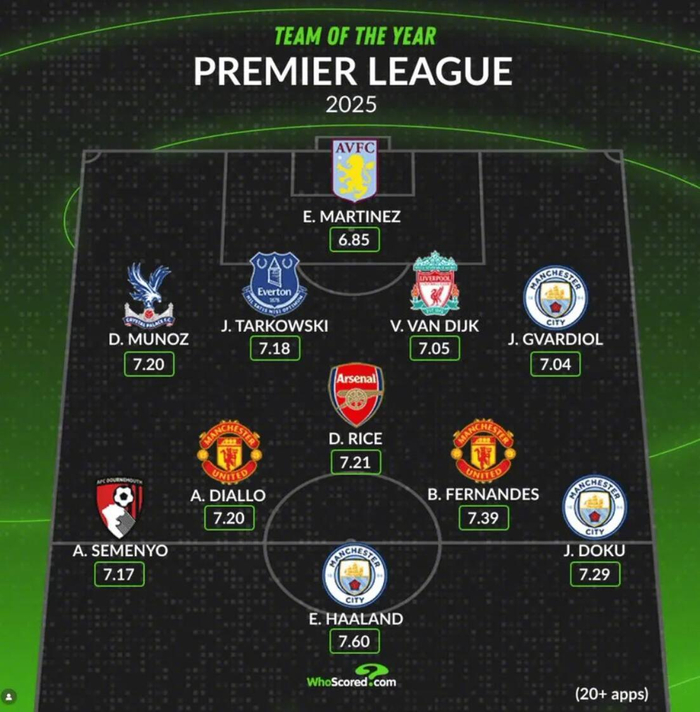 Whoscored根据球员评分,评选出了2025年度英超最佳阵容(参选球员的出场数不得少于20场)。