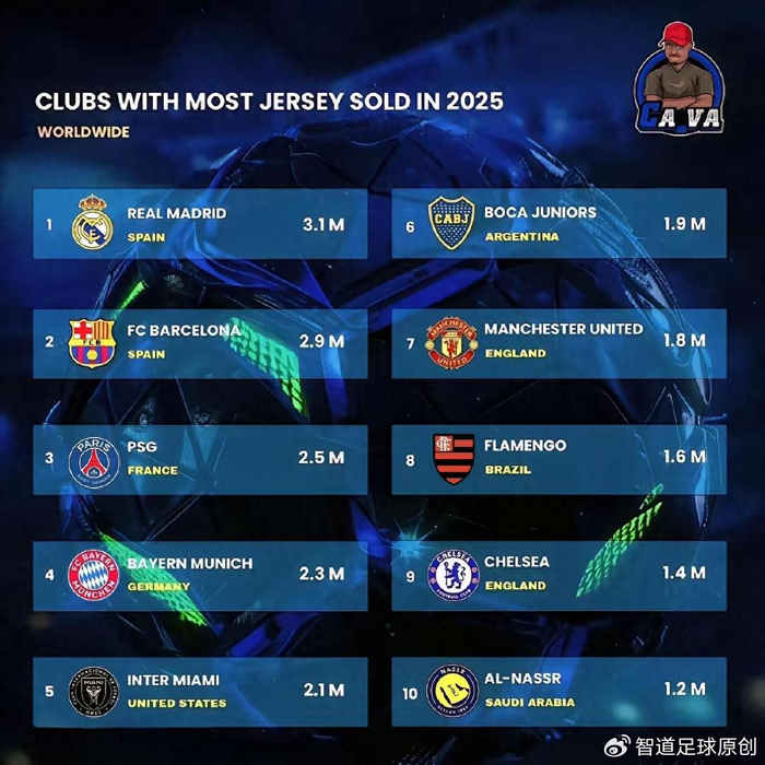 2025年已经过去,2026年已经来临。那么问题来了,2025年足坛哪家俱乐部的球衣卖得最好?皇萨依然稳居前二,三冠王巴黎第三,拜仁第四,而梅西让迈阿密国际的球衣销量直接上升40%,飙升至第五,C罗所在的利雅得胜利仅排名第十。