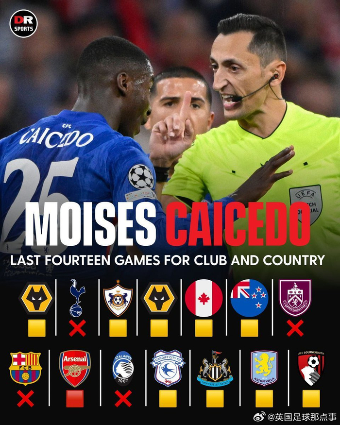 下一轮切尔西客场迎战曼城,凯塞多因累计黄牌停赛。#切尔西2比2伯恩茅斯#