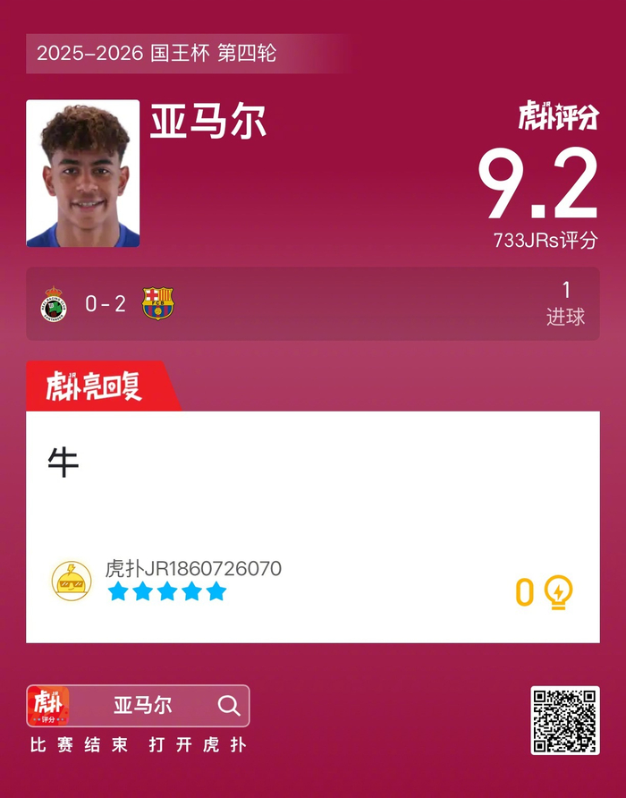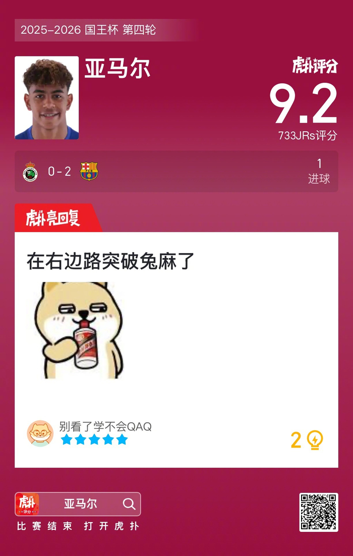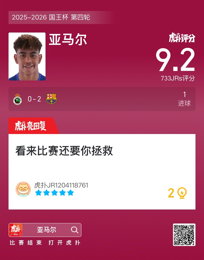 #桑坦德竞技0比2巴萨# 亚马尔打进一球,赛后收获9.2的虎扑评分!