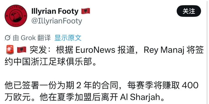 2026年1月16日,外媒“EuroNews”报道,前巴萨前锋、沙伽现役球员马纳伊将加盟中超球队浙江队。据了解,现在马纳伊与浙江队已签下了为期2年的合同,而他每赛季可以拿到400万欧元的工资。值得一提的是,报道说他每个赛季可以赚400万欧元,而中超限薪令规定外援的顶级工资只能300万欧元1年,因此这里可能是翻译出现了误差,大概率400万欧元的收入是他2年的工资,并非1年的收入。