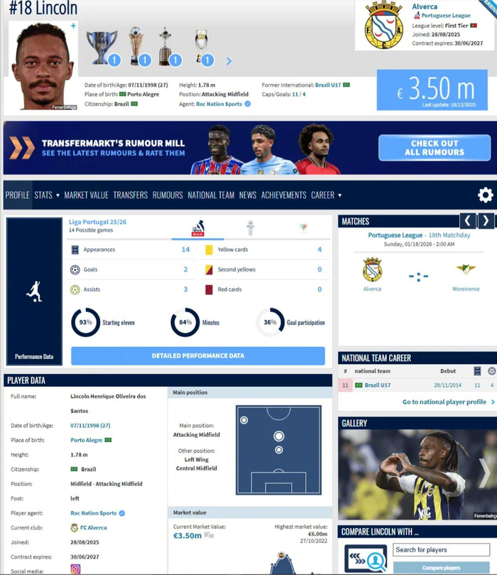 值得一提的是,这位巴西组织核心与阿尔韦卡(Alverca)的合同到2027年到期,他本赛季初从英冠俱乐部赫尔城(Hull City)加盟阿尔韦卡,此前他被费内巴切租借至赫尔城。