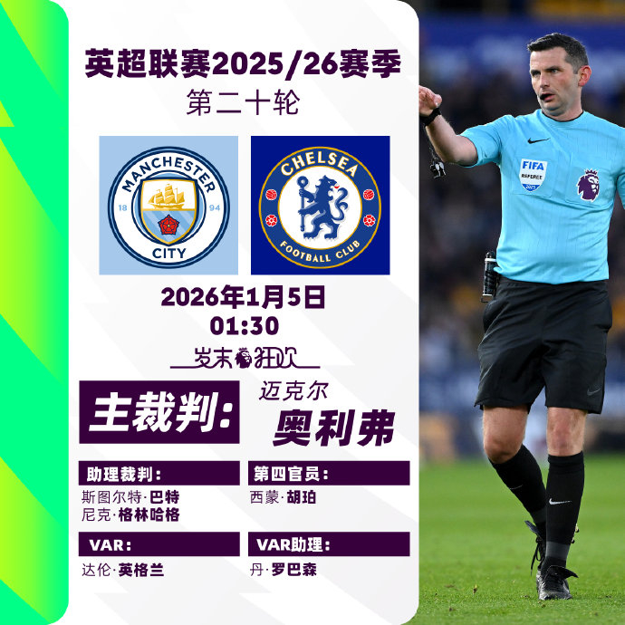 2025/26赛季英超联赛第二十轮主裁判名单