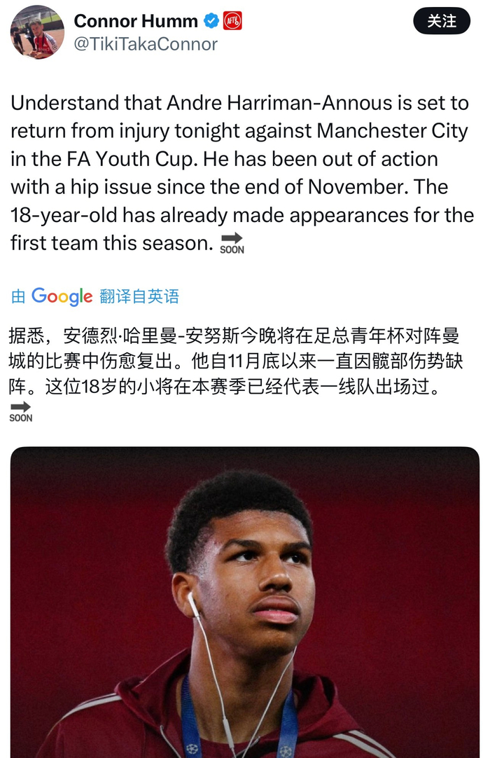 不过安努斯已经可以复出踢曼城U18,11月底受的伤