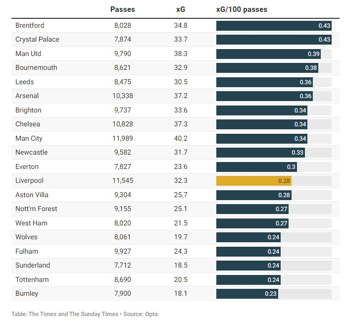 然而,利物浦每百次传球的预期进球数仅为0.28,在英超所有球队中排名第12位。这一数据充分凸显出球队在创造进攻机会方面的挣扎,也让外界愈发觉得利物浦的比赛踢得沉闷乏味。同时,这也是过去五个赛季里,球队该数据首次跌破0.3。