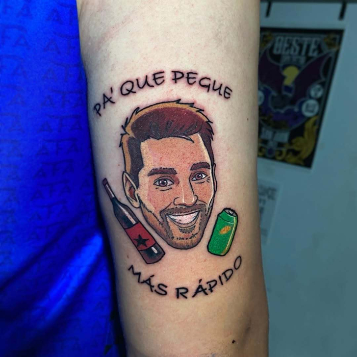 一名球迷将梅西+红酒+雪碧纹上身了,甚至还配文“为了能更容易上头!”