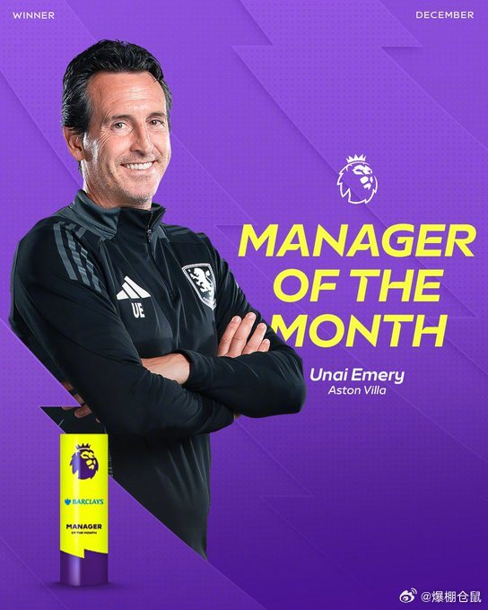【官方】阿斯顿维拉主教练埃梅里当选英超12月最佳主教练,12月带队6胜1负。