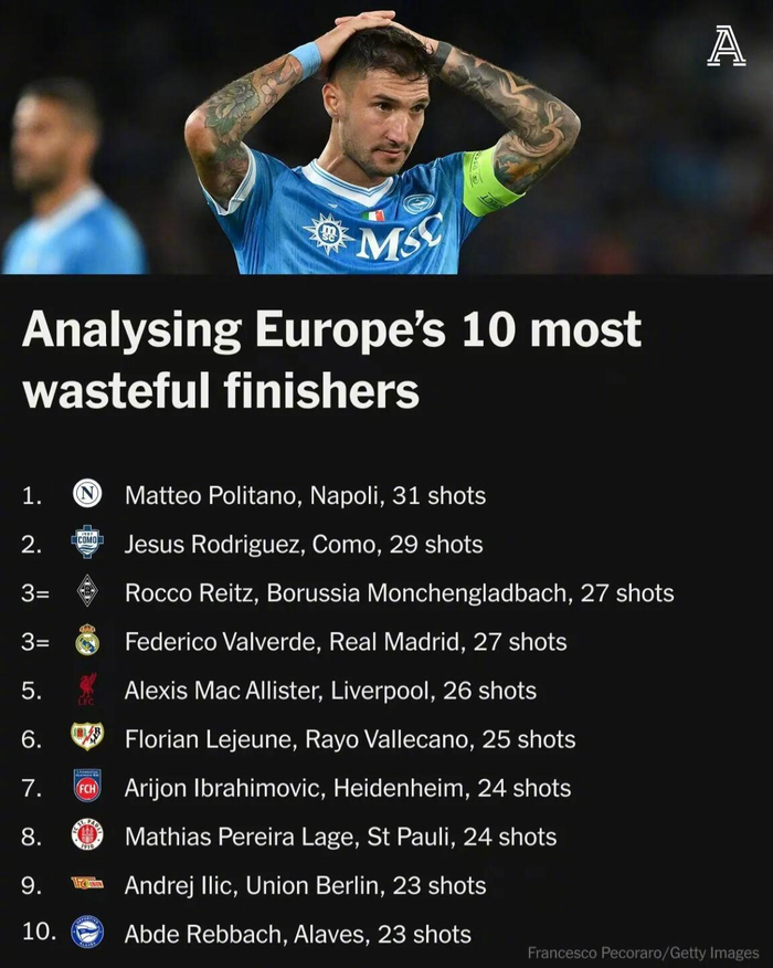 欧洲足球赛季已过半程,当众多前锋为金靴奖激烈争夺时,另一份令人尴尬的数据榜单同样引发了关注。