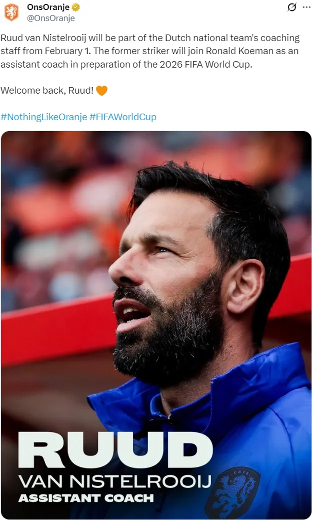 官方:荷兰宣布范尼进入教练组,他将担任科曼的助教。