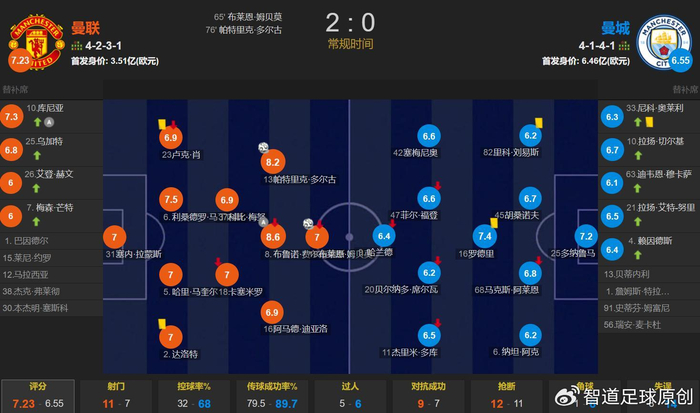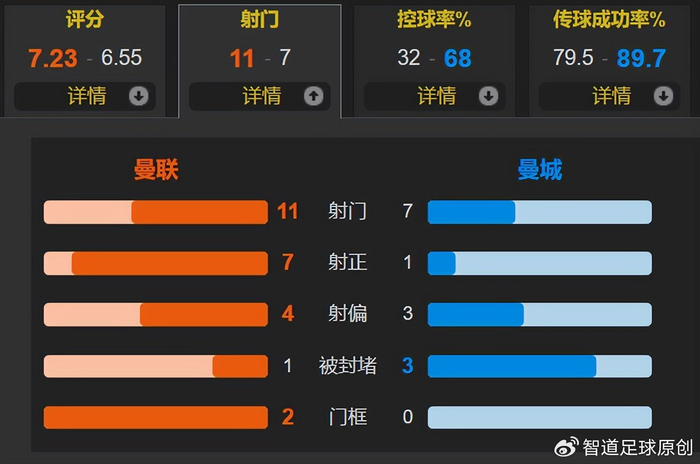 全场比赛,曼联的控球率仅有32%,但一共有11次射门,其中7次射正;曼城一共有7次射门,其中仅有1次射正。曼市德比,瓜迪奥拉执教的曼城仅有1次射正你见过吗?此役是曼城彻头彻尾的惨败,若不是多纳鲁马神扑,已经是惨案。为什么曼城会输得如此之惨?除了曼联踢得好之外,与瓜迪奥拉的傲慢息息相关。曼城主力中卫迪亚斯和格瓦迪奥尔都伤了,残阵后防线,可以说是弱不禁风,瓜迪奥拉还是不加强中场的防守,搞一个不在状态的罗德里单后腰,身前是不擅长防守的福登和B席,连夜雨偏逢屋漏,船破又遇顶头风,还开了窗任风吹雨打,这样的中场不被打穿才怪呢!