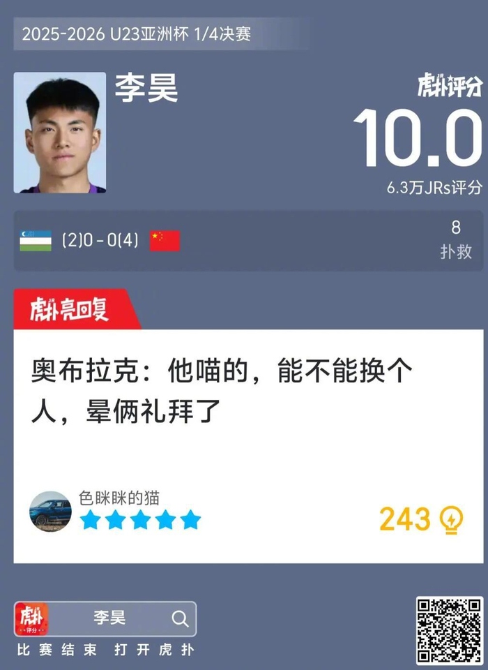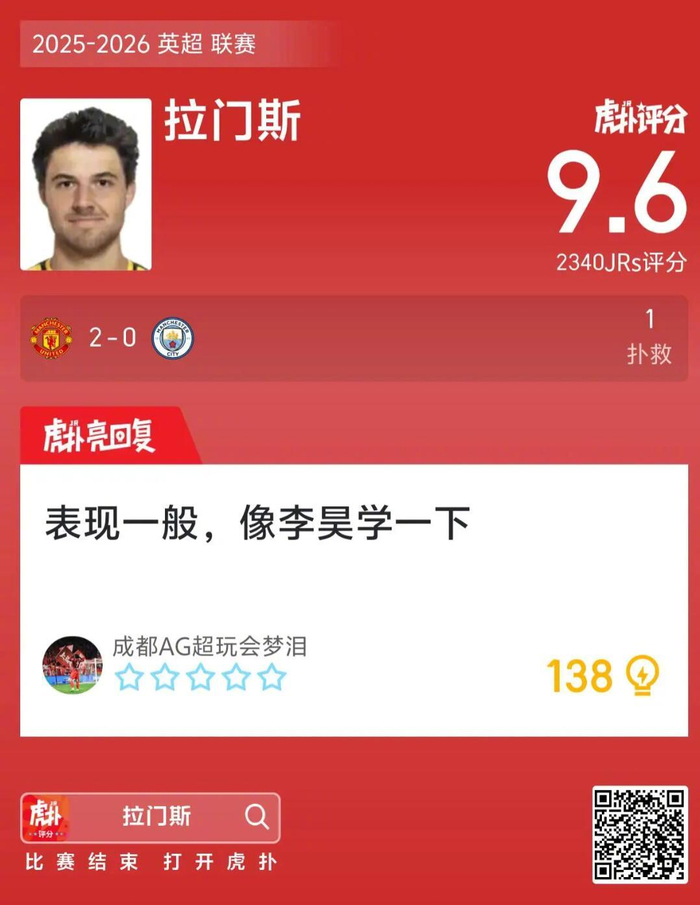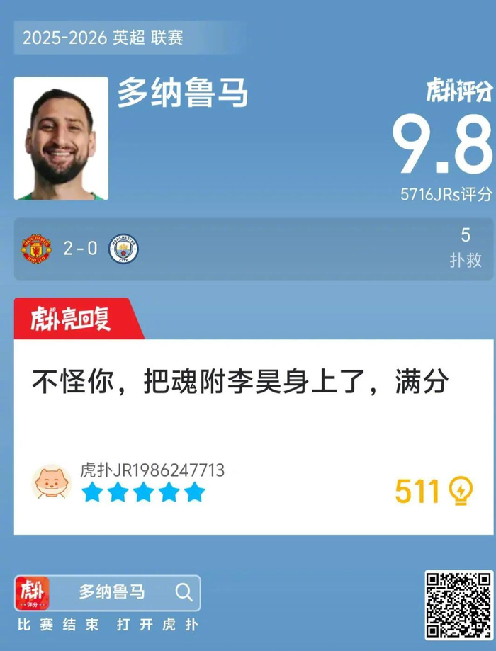 这三场比赛的评分区中,虎扑球迷贡献了不少神评,这其中对于三位门将的评论联系颇多,“李昊”这个名字频繁出现在曼城门将多纳鲁马与曼联门将拉门斯的评分区。