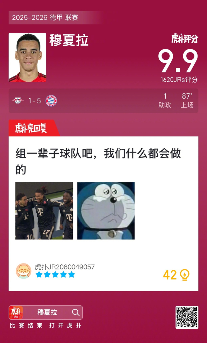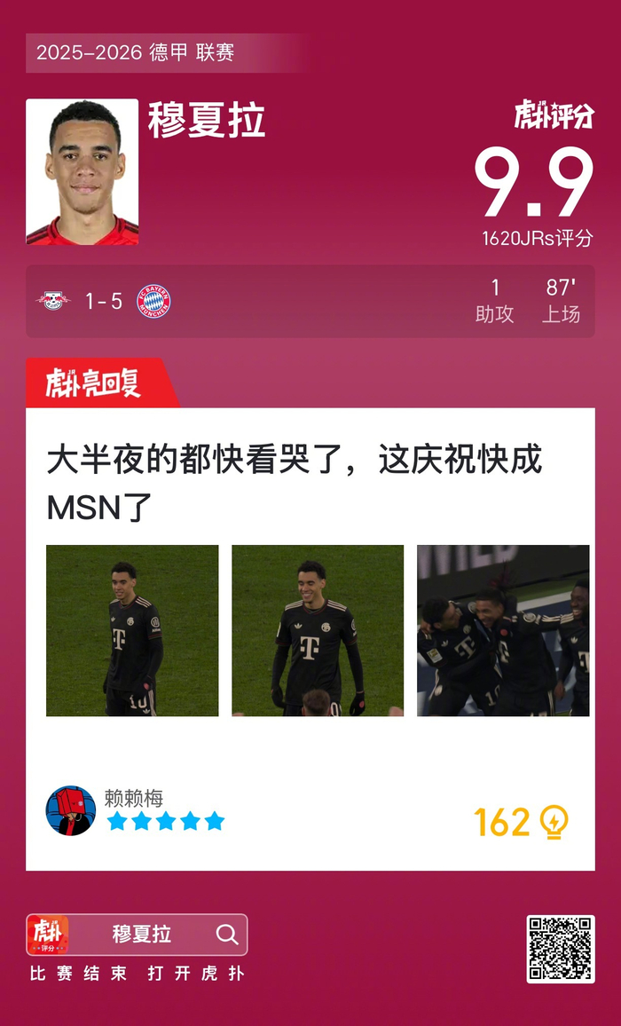 #rb莱比锡1比5拜仁# 穆夏拉贡献一次助攻,赛后收获9.9的虎扑评分!
