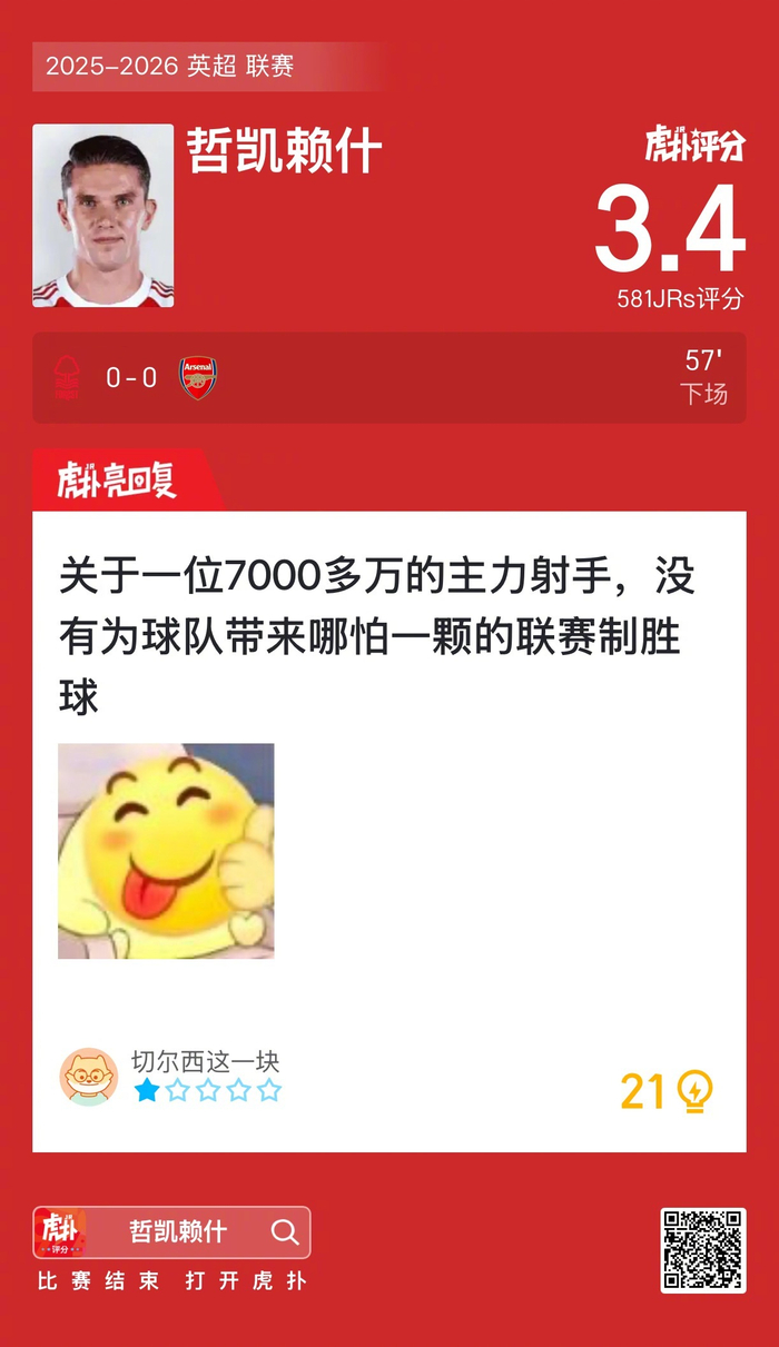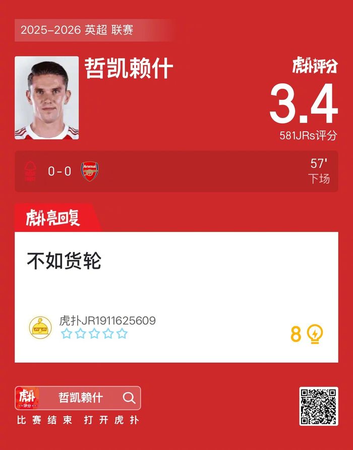 #诺丁汉森林0比0阿森纳# 哲凯赖什赛后收获3.4的虎扑评分!