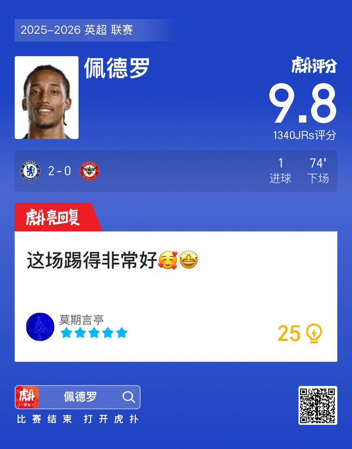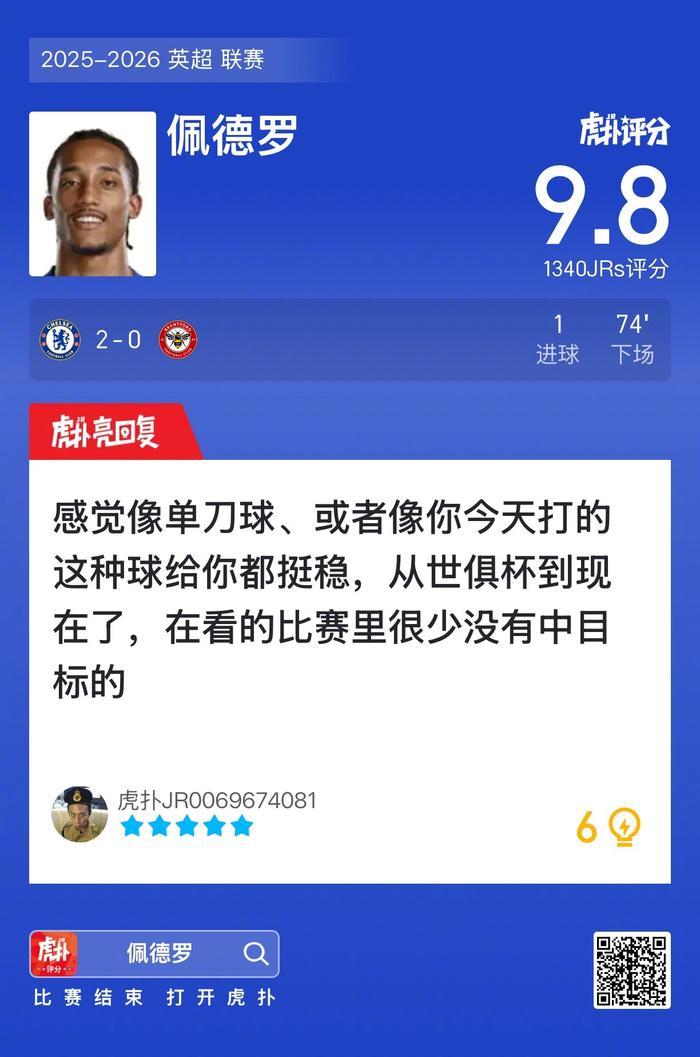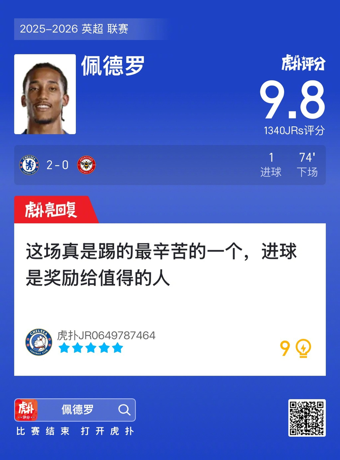 #切尔西2比0布伦特福德# 佩德罗打进一球,赛后收获9.8的虎扑评分!
