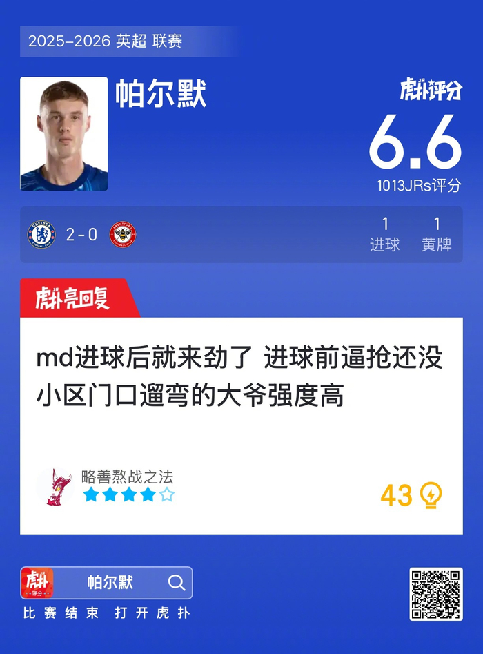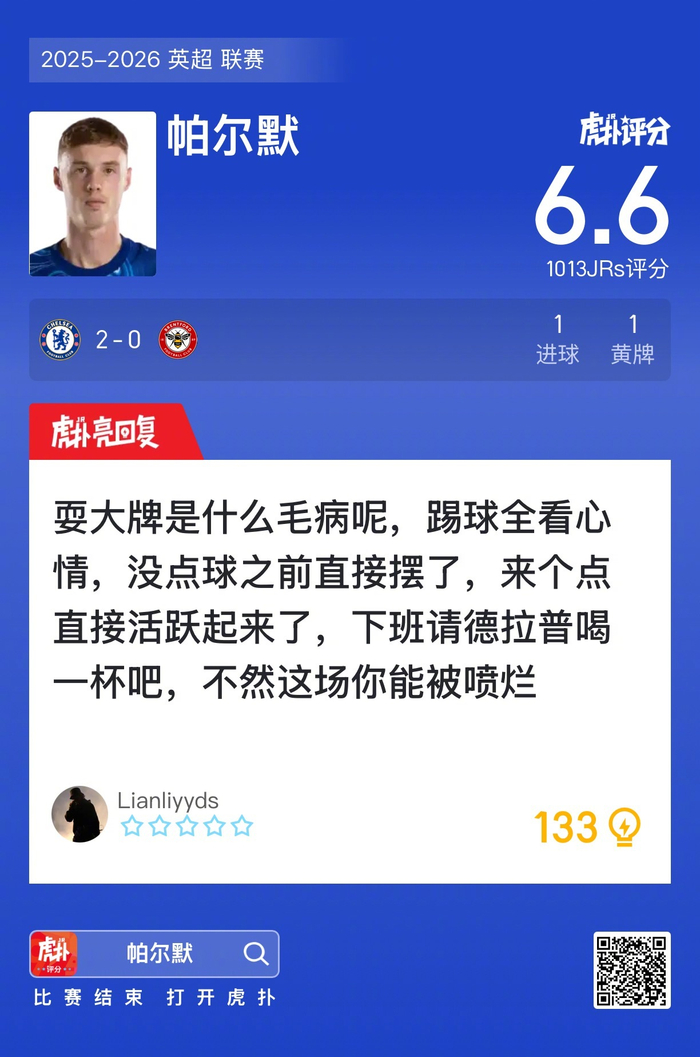 #切尔西2比0布伦特福德# 帕尔默打进一球,吃到一张黄牌,赛后收获6.6的虎扑评分!
