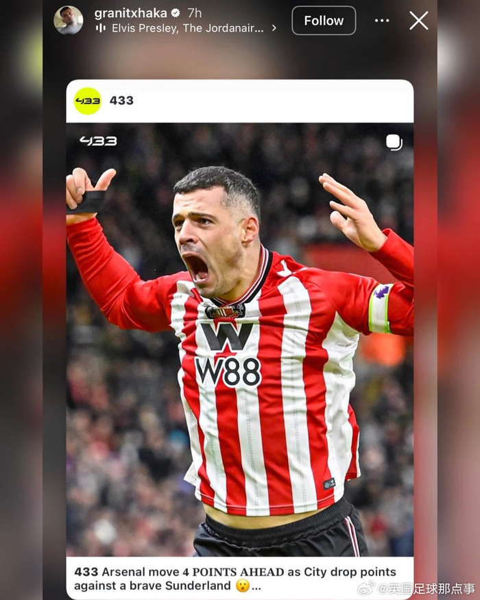 扎卡在 IG 上分享了一条动态,原文是:“桑德兰顽强牵制曼城,帮助阿森纳将领先优势扩大到4分”🥺背景音乐选用了猫王埃尔维斯·普雷斯利的《Can’t Help Falling in Love》。#桑德兰0比0曼城#