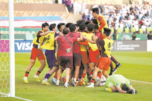 中国队在点球大战后庆祝获胜 本文图片 新华社