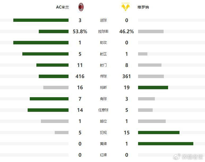 起势的AC米兰,在第53分钟彻底终结了胜负的悬念,莫德里奇远射造成维罗纳门将扑救脱手,恩昆库补射上演梅开二度,将领先的优势扩大到了3-0,余下的时间,AC米兰开始掌控节奏,虽然没有进一步扩大优势,但没有给维罗纳任何的机会,如愿在主场完成零封。