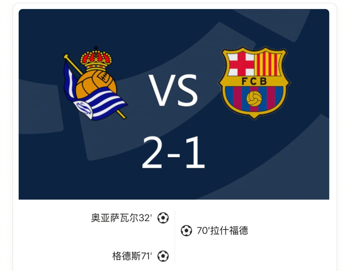 战报:皇家社会2-1巴萨,格德斯传射拉什福德破门!