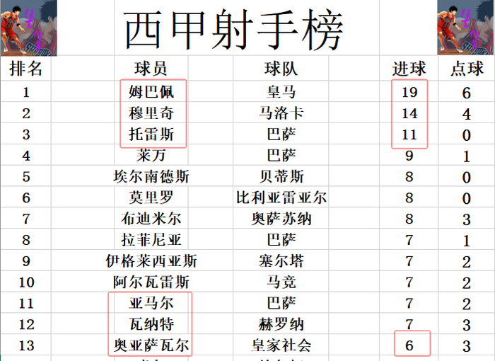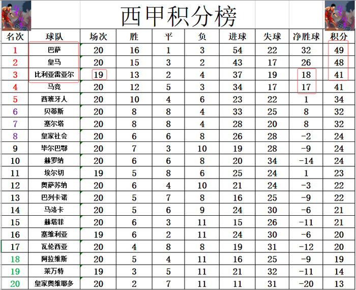 然而前场好不容易扳平比分,巴萨后防却在1分钟后再度失守,皇家社会左路快速反击,刚替补登场的穆尼奥斯后排插上下底传中,索莱尔小禁区前沿抢点强力头槌攻门,门将加西亚扑球脱手,索莱尔机敏跟进抢到第2落点倒三角再将球传到小禁区右侧,格德斯右脚凌空扫射半空门得手,皇家社会2:1闪电般再次取得领先。第86分钟,巴萨左路压上,佩德里禁区角上斜吊门前,孔德小禁区前沿抢点强力头槌攻门,BOOM的一声,皮球叕一次被门框挡出,巴萨今天这运气也是没谁了。第88分钟,索莱尔防守时爆铲佩德里,主裁在VAR确认后,取消了黄牌,直接红牌将索莱尔罚下。补时阶段,巴萨左侧角球机会,拉什福德操刀主罚大力往门前兜,皮球直接击中门柱弹出,门将雷米罗也是抱住门柱感谢了一番。最终巴萨全场5次中框的情况下,1:2不敌皇家社会,11连胜惨遭终止。 积分榜方面,巴萨11连胜被终止后,下半程刚开始,他们就被皇马将分差缩小到了1分,两队的争冠悬念还是很大。比利亚雷亚尔本轮输球,无力再往前追皇马,而且今天马竞今天赢球后追了上来,比利亚雷亚尔仅凭1个净胜球守住第3。 射手榜方面,姆巴佩19球领跑,穆里奇14球紧随其后,托雷斯今天首发未能进球,还是11球排在第3。莱万替补登场同样没有进球,9球排在第4。奥亚萨瓦尔打入一球,还差1球才能挤入前十。