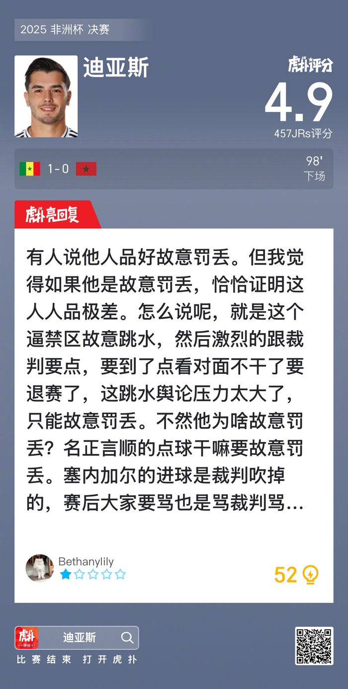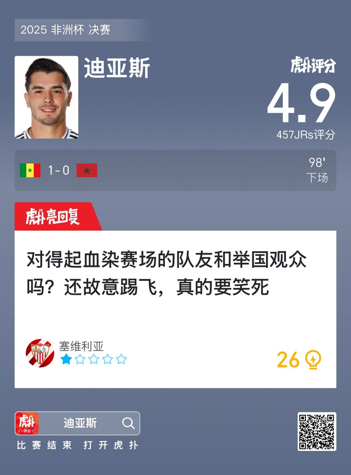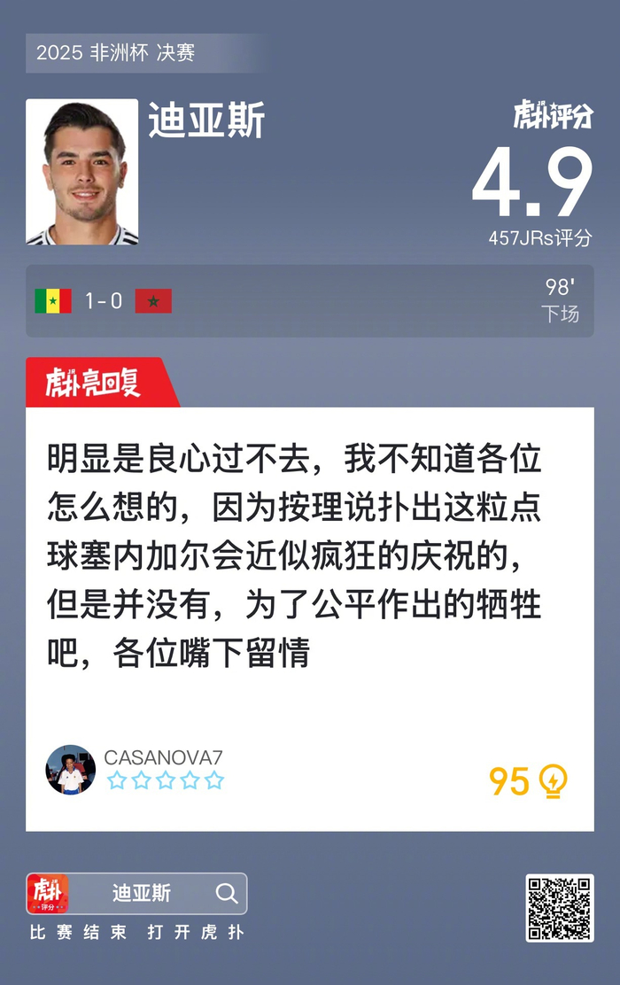 #塞内加尔夺得非洲杯冠军# 迪亚斯赛后收获4.9的虎扑评分!