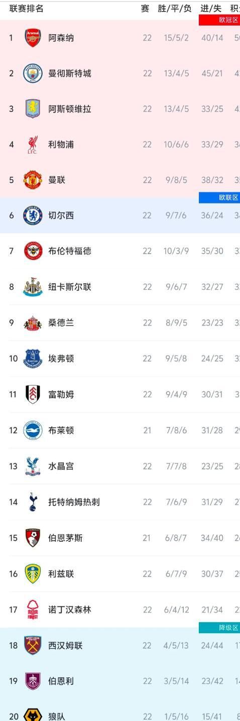 在今夜的几场英超比赛结束后,英超积分榜的形势也迎来了新的变化。
