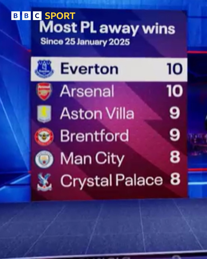 埃弗顿和你厂并列成为过去一年客场赢球最多球队🤯
