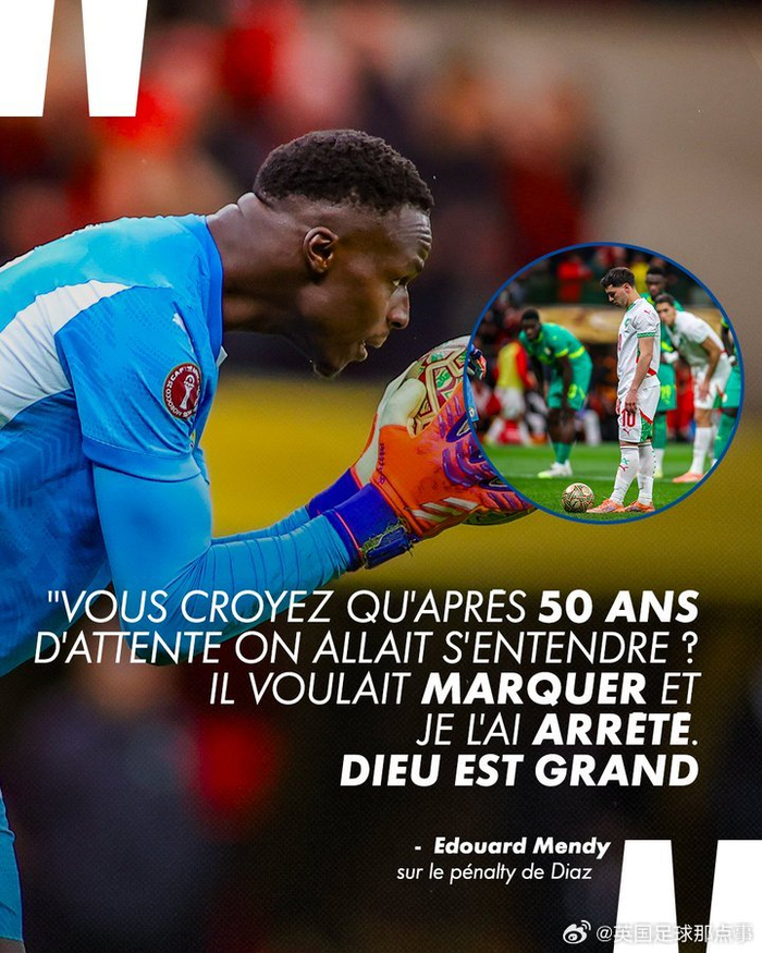 【辟谣对手故意丢点】塞内加尔门将门迪接受采访时被问到:迪亚斯是故意罚丢的那粒争议点球吗?门迪:“不是的,当然不是。我们得认真一点。你真的认为在比赛只剩下一分钟、而一个已经等待冠军50年的国家面前,我们还能达成什么协议吗?他是想进球的,而我把球扑了出来,这就是全部。”非洲杯决赛补时阶段,摩洛哥获争议点球,塞内加尔球员罢赛离开球场。之后马内劝说队友回场完成比赛,迪亚斯勺子点球罚丢。#塞内加尔夺得非洲杯冠军# #塞内加尔1比0摩洛哥#