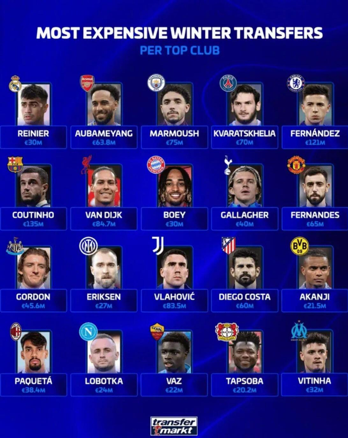 德国转会市场盘点了部分欧洲五大联赛俱乐部在冬季转会窗口完成的最贵签约,详情如下:
