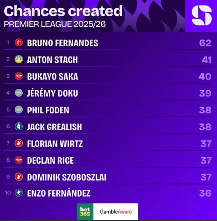 根据Squawka的统计,布鲁诺-费尔南德斯本赛季在英超联赛中创造的机会比任何其他球员都至少多21次: