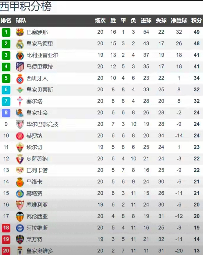 西甲赛场20轮战罢,皇萨依旧稳居前二。本轮巴萨1-2爆冷不敌皇家社会,让出关键3分,使得自己的领跑优势缩水至1分,皇马顺势缩小差距,本赛季的西班牙国家德比也因此成为左右冠军归属的关键战役。