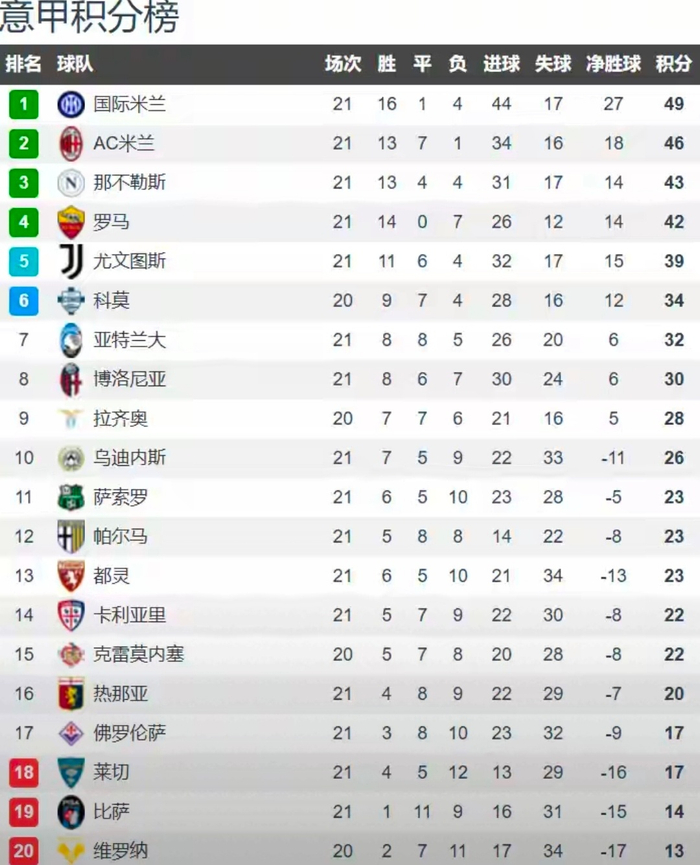 意甲21轮战罢,国际米兰以49分高居榜首,AC米兰46分紧随其后,卫冕冠军那不勒斯以43分位列第三。新帅齐沃执掌国米帅印后,面临双线作战的严峻考验,若能率队守住优势登顶意甲,将完成教练团队的完美更新换代;反观孔蒂则因双线作战调度失当备受诟病。3分的差距仅一步之遥,蓝黑军团仍是意甲冠军的最有力竞争者。