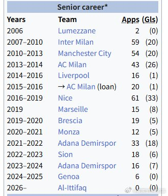 巴神还在追寻足球梦35岁的巴洛特利加盟以自由身加盟阿联酋次级联赛球队伊蒂法克,签约时长2年半这是他辗转效力的第13家俱乐部……