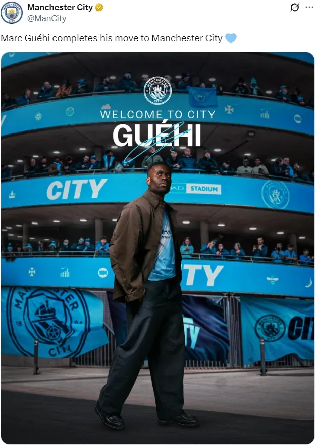 官方:曼城宣布从水晶宫签下了格伊,这名中卫签下了一份2031年到期的合同,英格兰人将身披15号球衣。