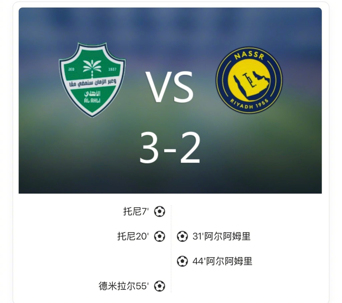 【沙特联:十人吉达国民3-2十人胜利,托尼两射一传】上半场托尼梅开二度,阿姆里梅开二度帮助胜利扳平比分,下半场德米拉尔头球破门再次领先,补时阶段双方各罚下一人,最终吉达国民3-2战胜了利雅得胜利。