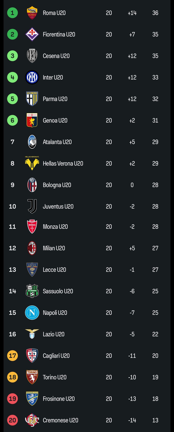 【预备队积分榜】2025-26赛季#意甲# 预备队联赛第20轮积分榜: