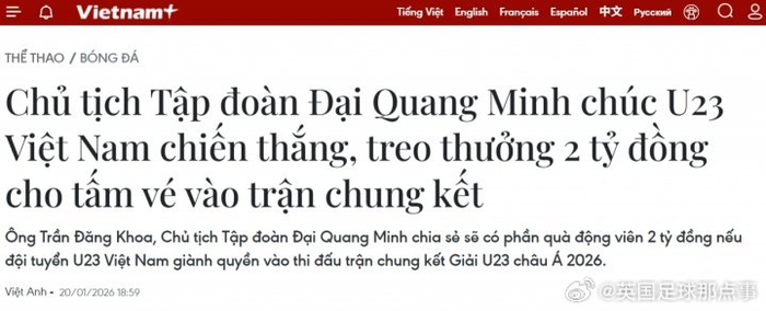 【奖金40亿】越南媒体越通社:越南企业大光明集团和TV360宣布,若越南U23能够击败中国进入决赛,两家企业将分别奖励球队20亿越南盾,共计40亿越南盾(约106万人民币)。#U23国足VS越南U23#
