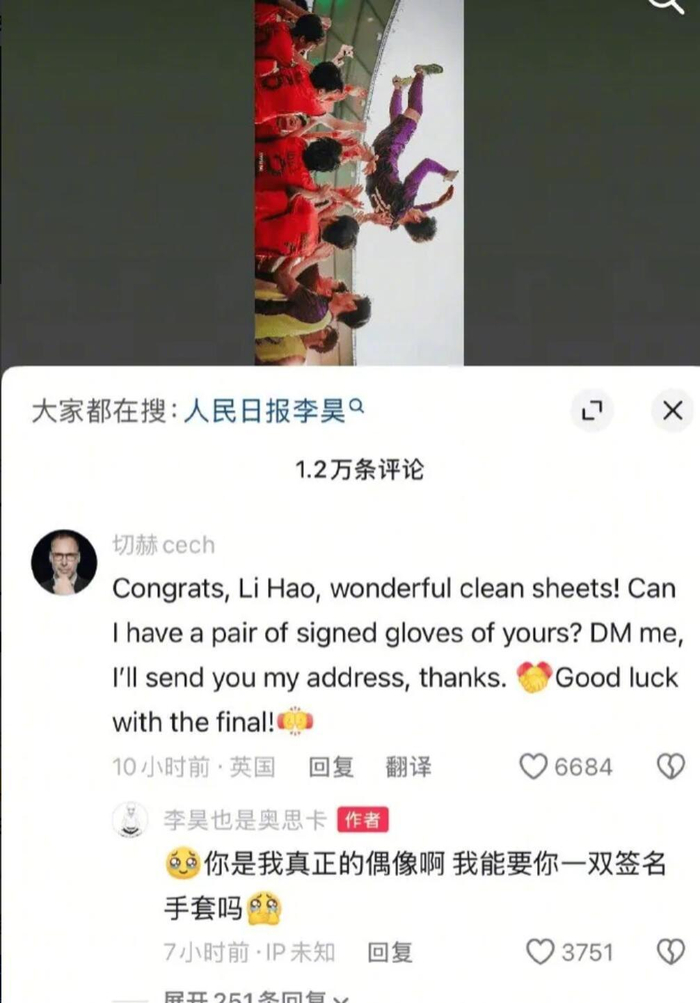 此番李昊助力球队取胜且完成零封,切赫本人也特意现身其社交媒体评论区,留言道:“祝贺你李昊,精彩的零封!可以给我一双你的签名手套吗?私聊我,我会给你我的地址,谢谢,决赛好运!”