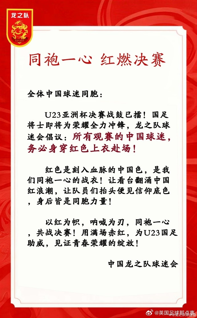 中国龙之队球迷会发布观赛倡议:观战U23亚洲杯决赛的中国球迷务必身着红色上衣赴场助威。#U23国足vs日本U23#
