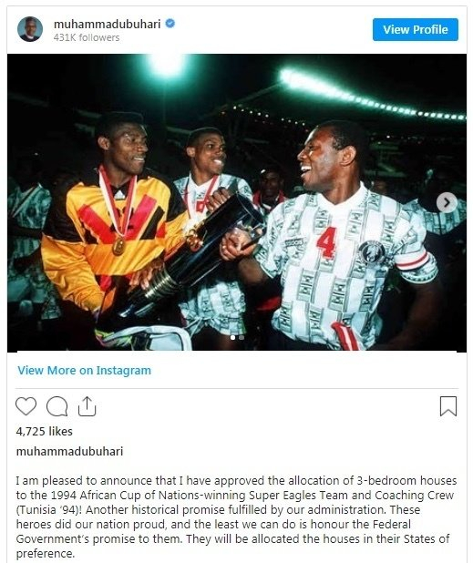 2021年6月,尼日利亚总统布哈里批准向当年那支夺冠的球队成员分配一套三居室房屋,共有22名人员获得这一奖励,可惜包括时任尼日利亚队长兼教练斯蒂芬-克什在内的5人已经去世。