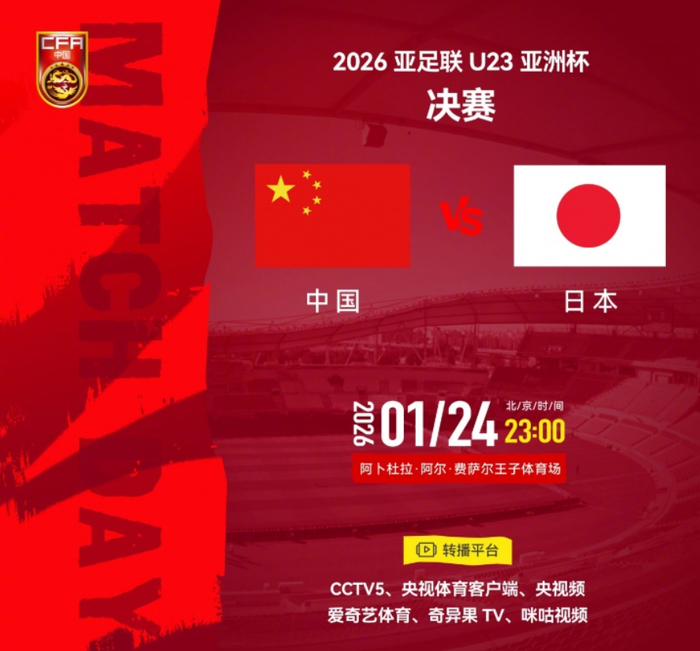 备受关注的U23亚洲杯决赛将在北京时间1月24日晚上23点00分打响,中国男足对阵日本男足,这是本届赛事最后一场,也是中国队改写历史的最关键一战。