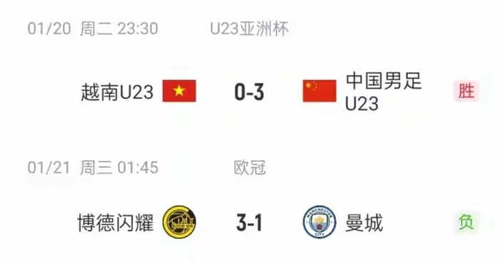 淘汰赛中,中国U23先是力克乌兹别克斯坦闯入四强,随后击败越南挺进决赛;而同一时间开赛的曼城,先是英超曼城德比0-2不敌曼联,又在欧冠赛场1-3爆冷负于博德闪耀,接连爆出冷门。