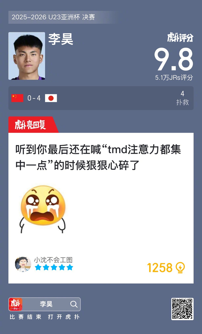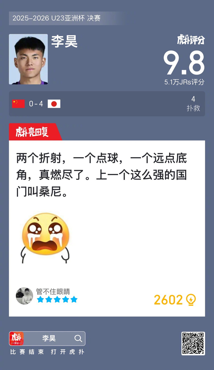 李昊本场比赛贡献4次扑救,这场表现你给几分?