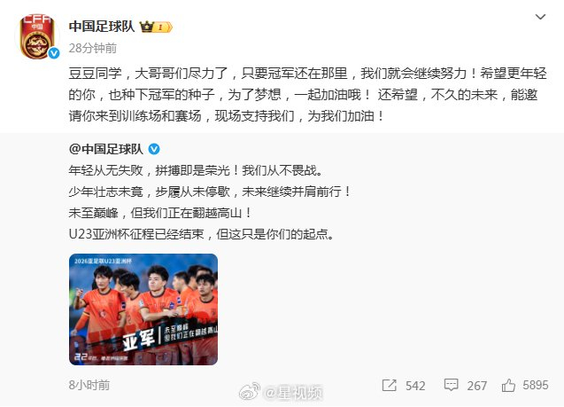 #中国足球队说球员们尽力了#【#中国足球队喊话曾为U23国足哭泣的男孩#】2026亚足联U23男足亚洲杯决赛,#U23国足0比4日本队#,获得亚军。1月25日上午,@中国足球队 发文喊话曾为中国队0:3战胜越南队激动哭泣的男孩豆豆同学:大哥哥们尽力了,只要冠军还在那里,我们就会继续努力!希望更年轻的你,也种下冠军的种子,为了梦想,一起加油哦! 还希望,不久的未来,能邀请你来到训练场和赛场,现场支持我们,为我们加油!据此前报道,9岁男孩豆豆因上学原因,未能观看u23比赛直播,第二天早上得知中国队3:0大胜越南队后,激动地哭了。