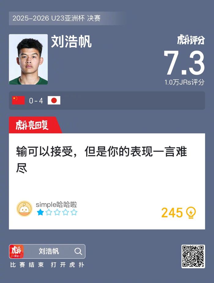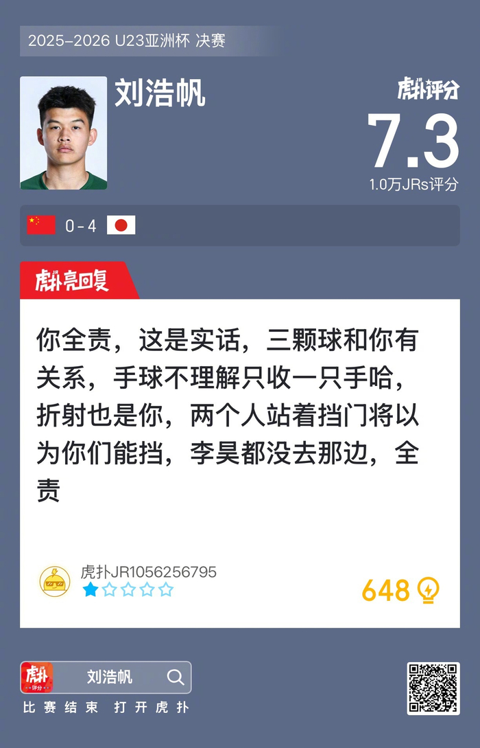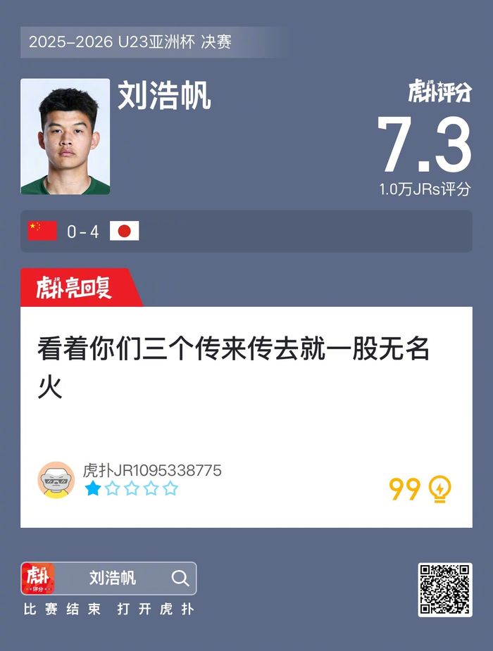 刘浩帆本场比赛仅收获7.3的虎扑评分!