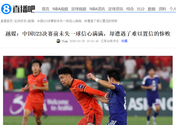 在中国队0-4输球之后,越南媒体《soha》报道了本场比赛,文章指出中国U23队遭遇了一场令人难以置信的惨败,眼睁睁地看着日本U23队连续两届赢得U23亚洲杯。