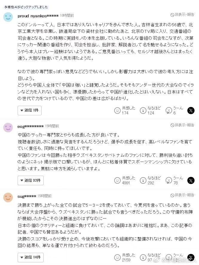 对于这个言论,也被雅虎体育转载到了网站上,不过很快这个言论也引发了日本球迷的热议。其中有日本球迷深挖了该评论员的履历,并直言他似乎是凭借大胆言论获得人气的,所以他看似专业的意见本身无关紧要。也有日本球迷对其批评,称中国所谓的足球专家们自己也该成长一下,虽然可能是为了博取收视率而发表过激亚纶,但他们同时也肩负着促进球员成长、培养高水平球迷的责任。